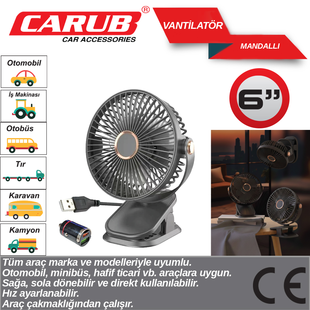 CARUB 12V 8 inch mandallı vantilatör, aracınızı serinletmek için ideal bir çözümdür. Bu vantilatör, 12V güç kaynağına bağlanarak araç içerisinde hızlı ve etkili bir hava akışı sağlar. 8 inch boyutuyla kompakt bir tasarıma sahiptir ve araç içindeki kullanım için uygundur. Mandallı yapısı sayesinde kolayca tutturulabilir ve istenilen yöne doğru ayarlanabilir. Yüksek kaliteli malzemelerden üretilmiş olan CARUB vantilatör, dayanıklıdır ve uzun ömürlü kullanım sağlar. Güçlü motoruyla sessiz bir şekilde çalışır ve sürüş deneyiminizi olumsuz etkilemez. Bu vantilatör, sıcak havalarda araç içindeki havayı hızlı bir şekilde dolaştırarak ferah bir atmosfer sağlar. CARUB 12V 8 inch mandallı vantilatör, kullanışlı tasarımı ve etkili performansıyla aracınızda rahat ve serin bir sürüş deneyimi sunar.